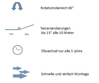 Dieses System erweitert Ihre Einsatzmöglichkeiten weit über das gewohnte Maß hinaus. Welliges, gestuftes und natürlich ebenes Terrain sind zukünftig gleichwertige Einsatzgebiete für dieses Nachführungsystem. Das Nachführungsystem ist wartungsarm und ein unter besonderem Fokus auf die Kompensation von Verwindungskräften konstruiertes, langlebiges System.